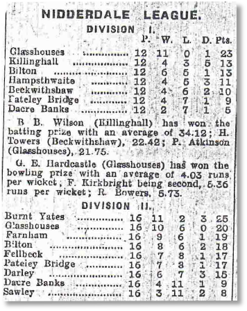 The top two clubs clashed at Hampsthwaite and a considerable interest was manifested in the match and a good number of spectators visited the Hampsthwaite ground. Hampsthwaite batted first and although the earlier batsmen did very well, there was a collapse towards the end of the innings. 2 wickets fell at 33, three for 39 but the last six wickets only realised 12 runs. Bell 6–31, F Kirkbright 3–22. Glasshouses scored the necessary runs for the loss of 3 wickets. Hampsthwaite 53: Glasshouses 57-3